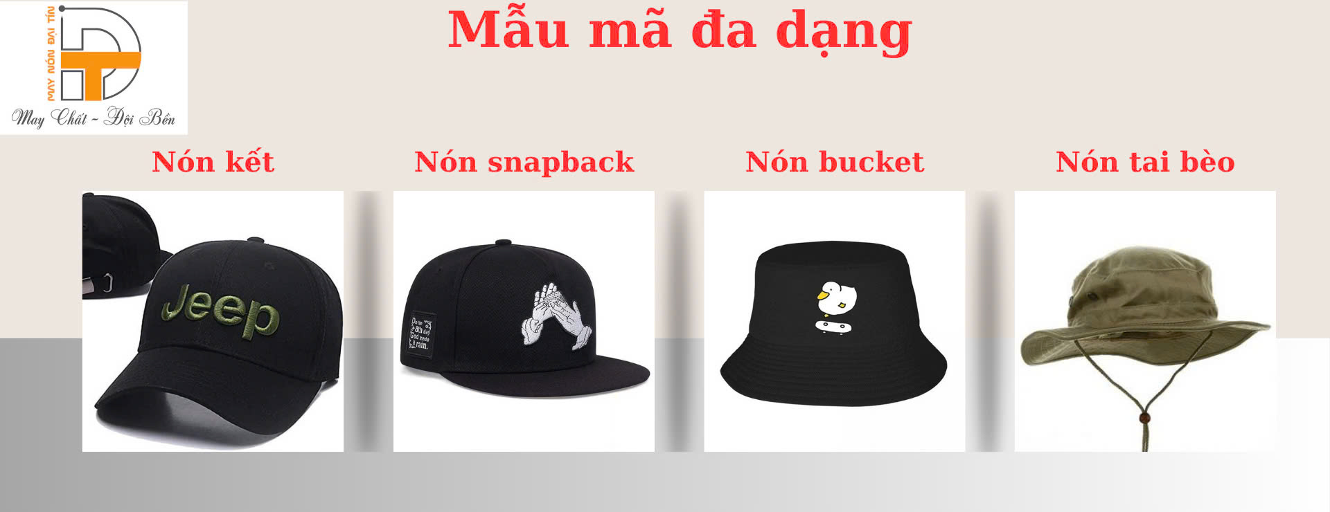 Đặc biệt, với phương châm “May chất – Đội bền” May Nón Đại Tín cam kết mang đến cho khách hàng những chiếc nón chất lượng đến từng đường kim mũi chỉ, bền bỉ hơn cả mong đợi của quý khách hàng. Ở chúng tôi luôn cập nhật những mẫu nón hot hit và theo kịp xu hướng trên thị trường hiện nay đảm bảo đáp ứng từng nhu cầu khách hàng.